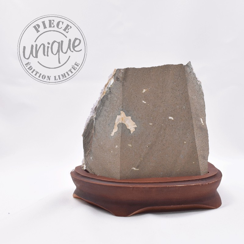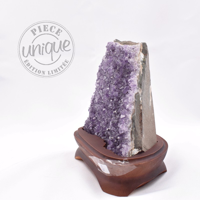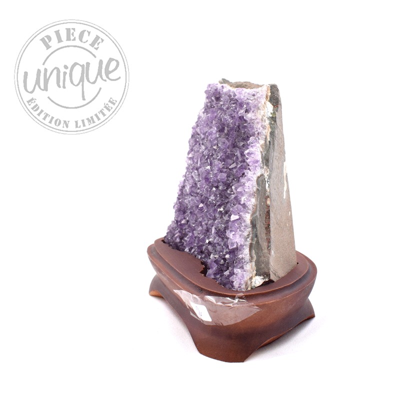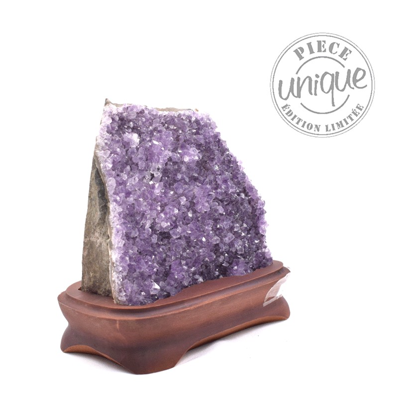 Bonita drusa de amatista de calidad extra sobre zócalo de madera barnizada.