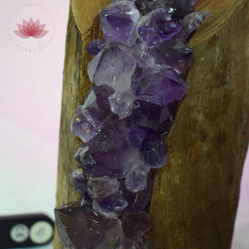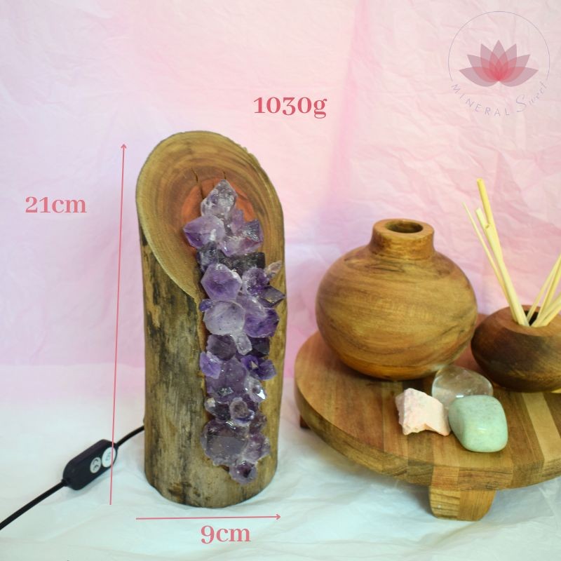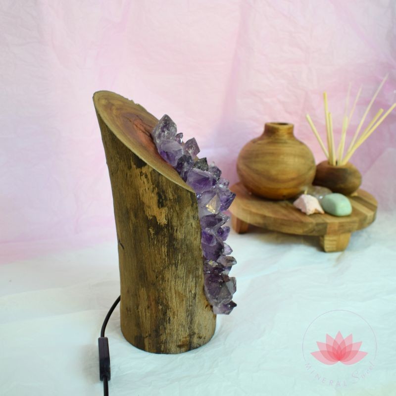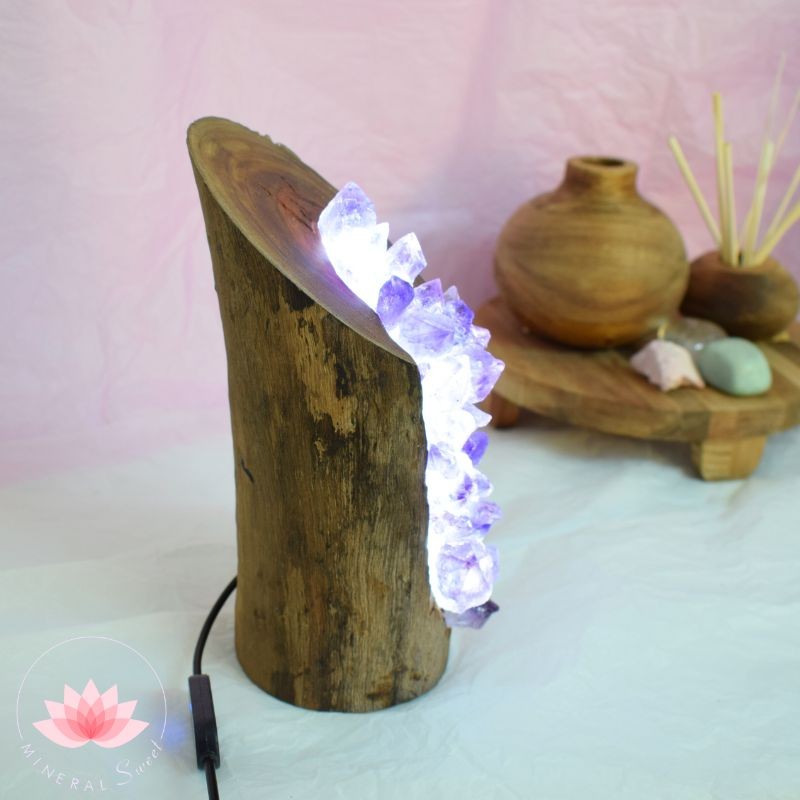 Preciosa lámpara con base de madera y Amatista en puntas naturales pegadas a la madera.