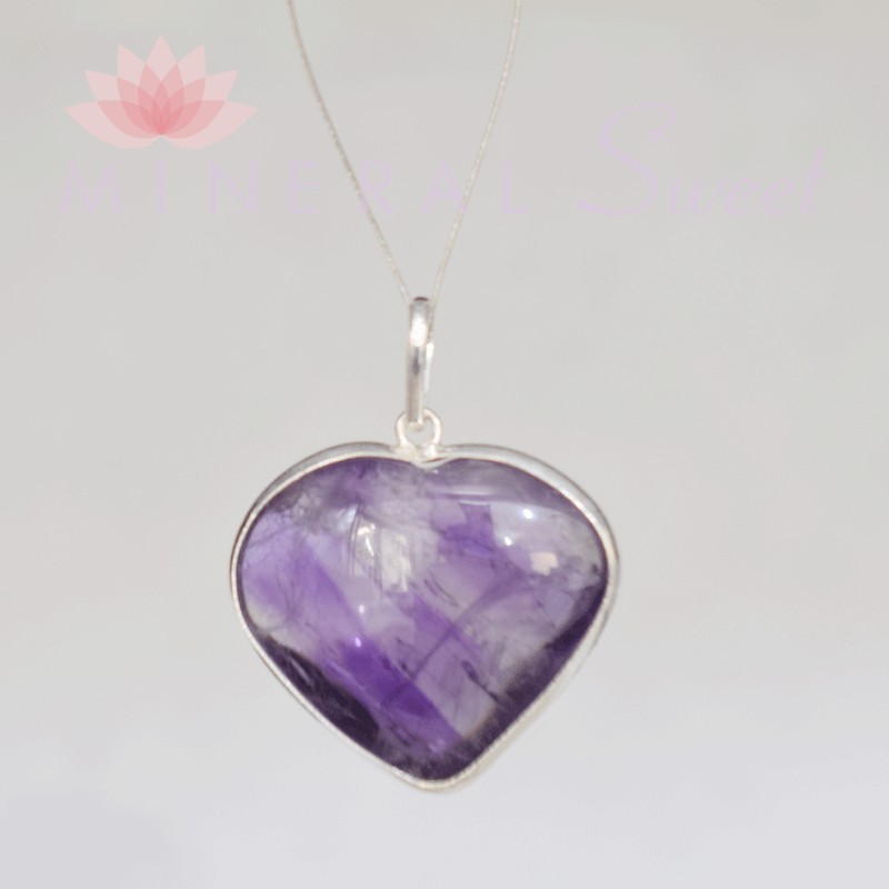 Bello colgante de amatista en forma de corazón, montado en plata.