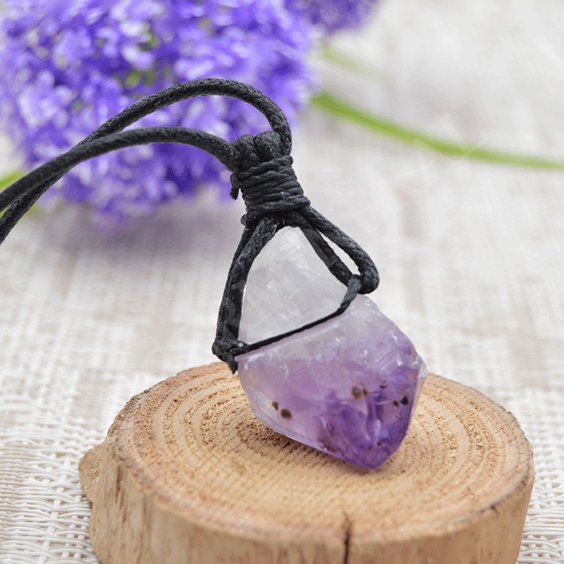 Colgante de amatista bruta con un cordón en color negro.