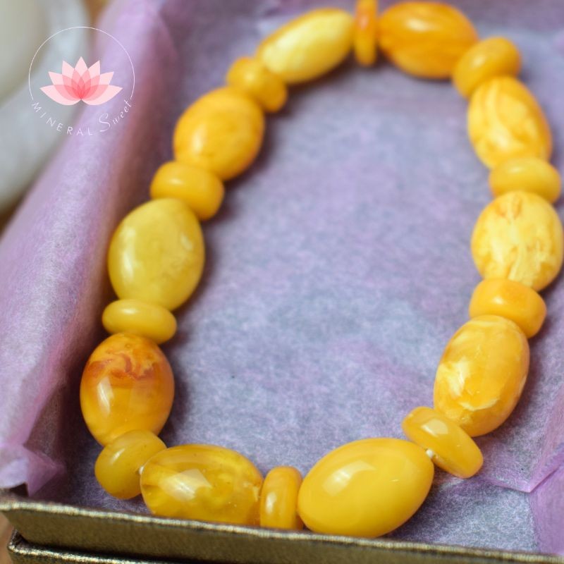 El ámbar ayuda a quien lo lleva a afirmarse y a tomar posesión de su lugar. Permite expresar la personalidad y también imponerse en un ambiente. Permite dinamizar la reflexión y el desarrollo intelectual. En este sentido, el ámbar ayuda a luchar contra las varias formas de la depresión. Por su color amarillo, solar, el ámbar está considerado como un mineral de alegría, de dinamismo, de confianza en uno mismo.