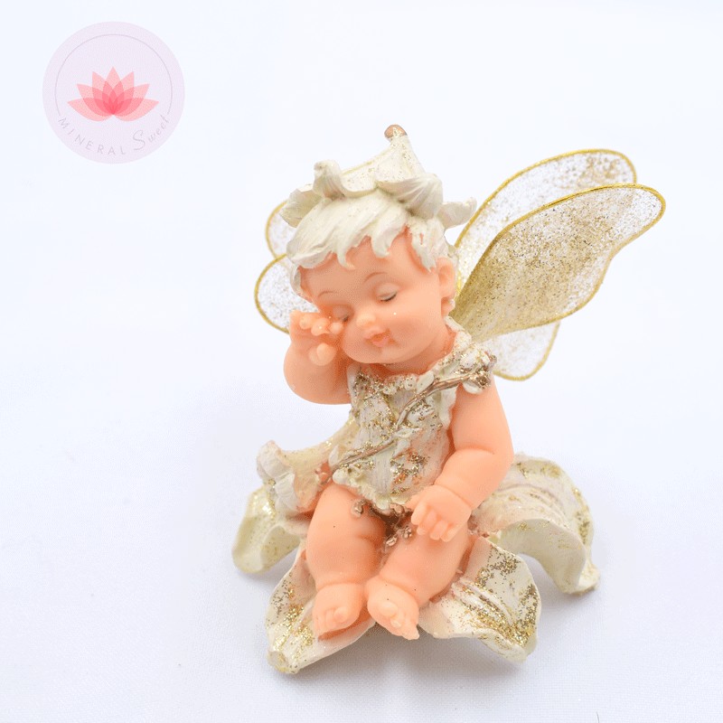 Bonitos ángeles bebé en resina sobre flores, con alas y detalles dorados.