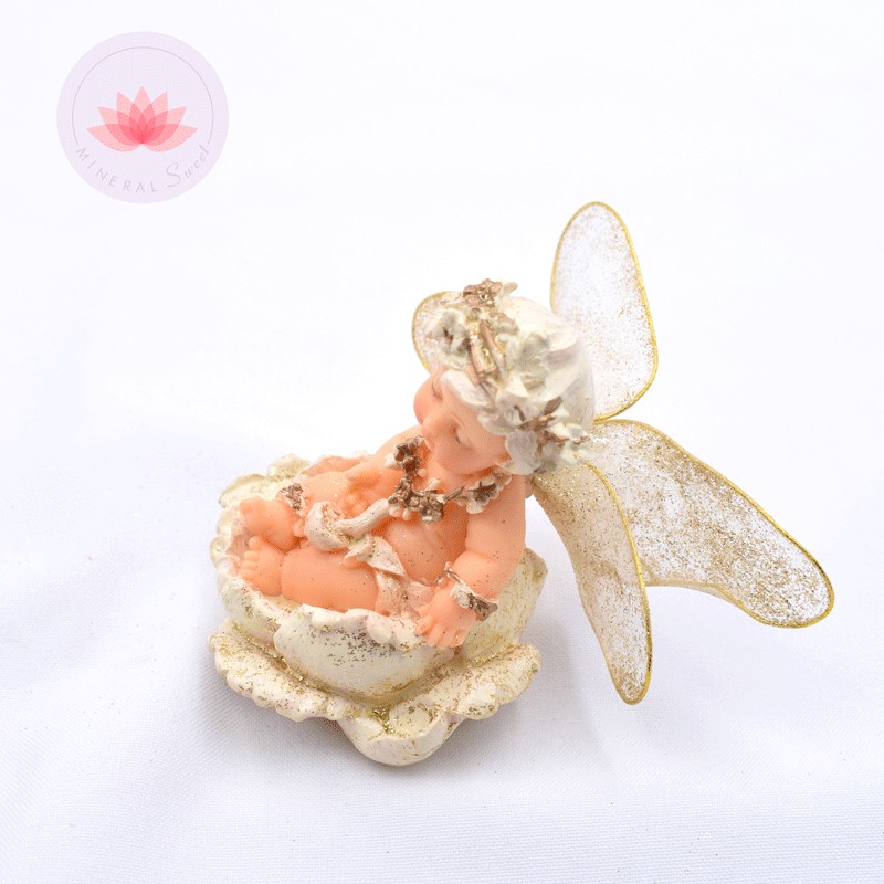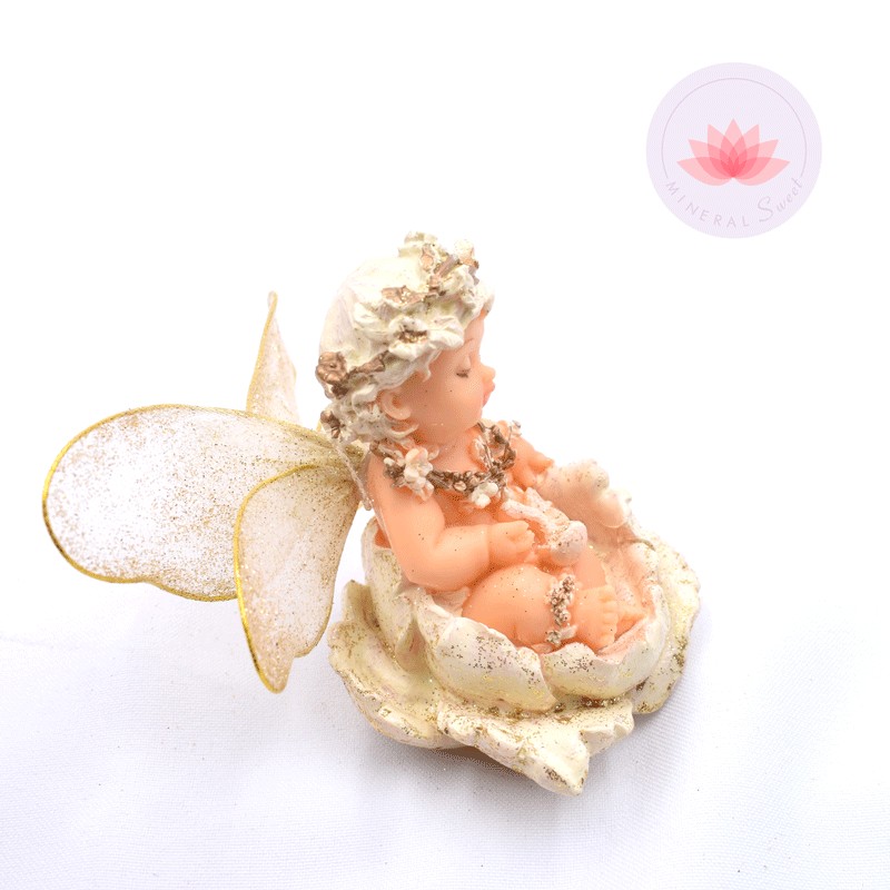 Bellos angelitos bebés sobre flores, en resina, con detalles y alas dorados