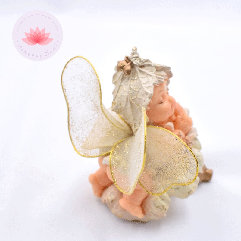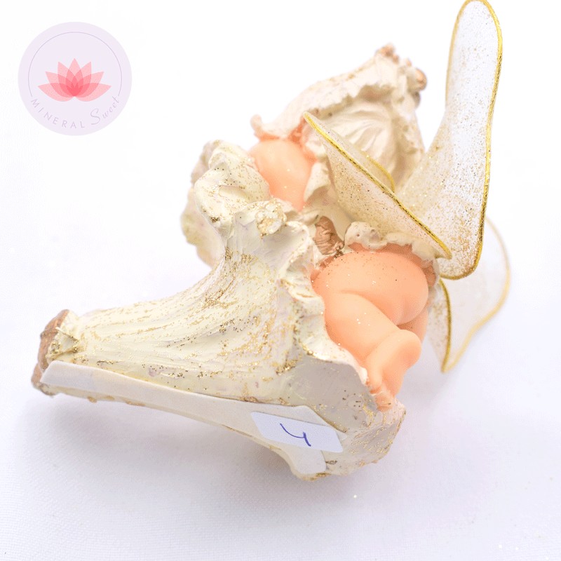 Bellos ángeles bebés sobre flores. Elaborados en resina. Con detalles dorados.