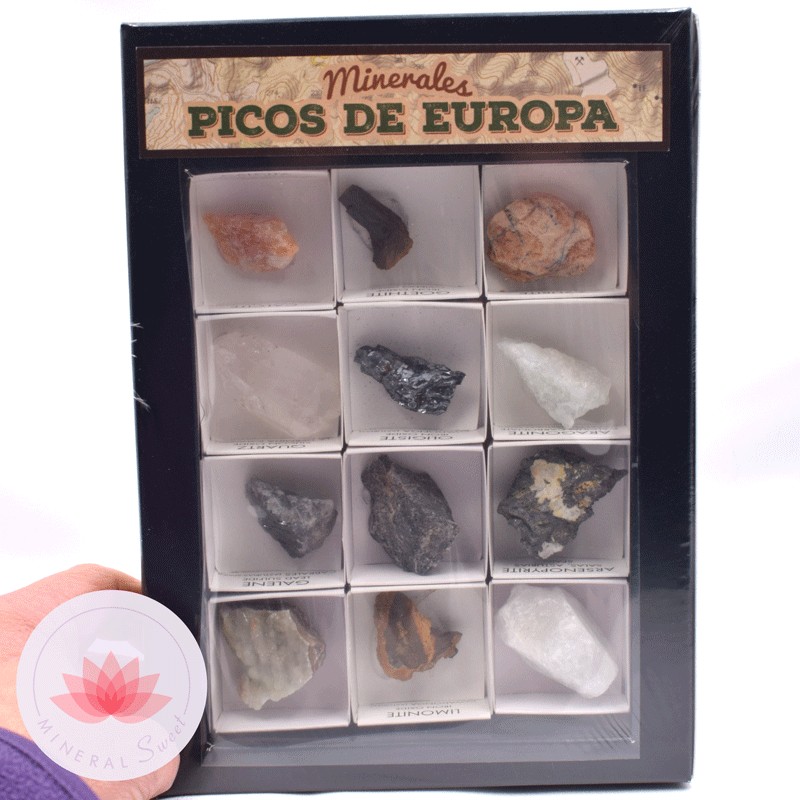 Caja con 12 minerales que se hallan en los Picos de Europa.