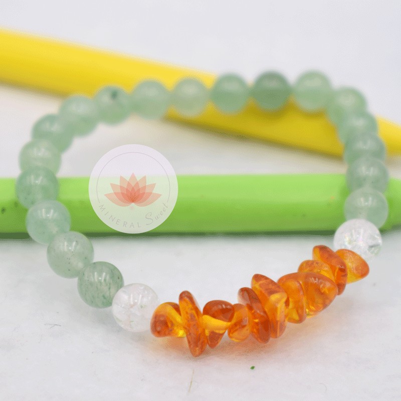 Bonita pulsera para niña en aventurina, cristal de roca y ámbar.