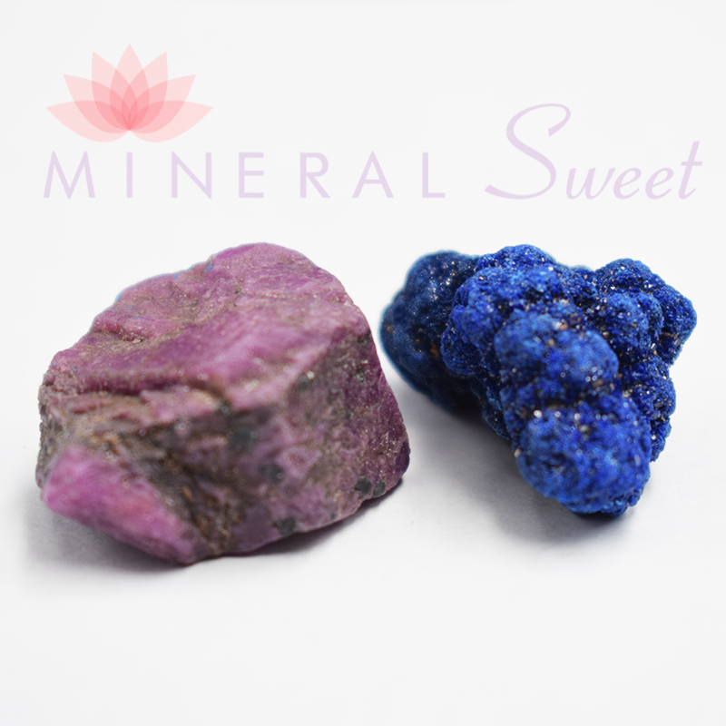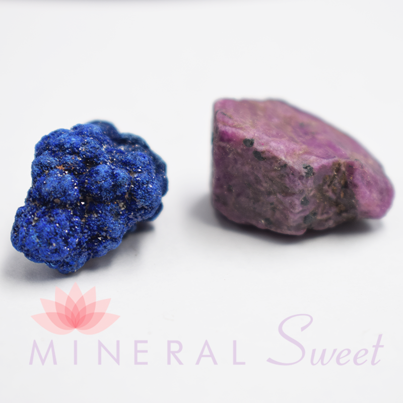 Pack compuesto por una piedra de Azurita cristalizada y un Rubí bruto (corindón).