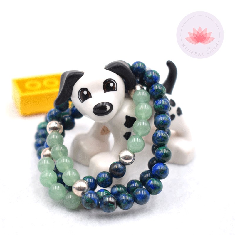 Pulsera para niño en Aventurina y Azurita, con 2 perlas en metal plateado