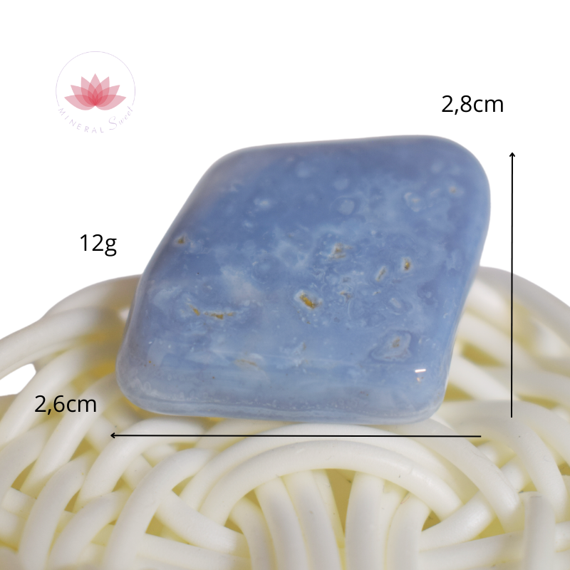 La calcedonia es un mineral compuesto de cristalitas de cuarzo de medidas comprendidas entre 50 y 100nm3 dispuestas en fibras. Se trata de una fase del silicio. Su fórmula es un dióxido de silicio (SiO2). Forma parte de la familia de las ágatas. Su color puede ser azul, gris lechoso azulado o malva pálido.