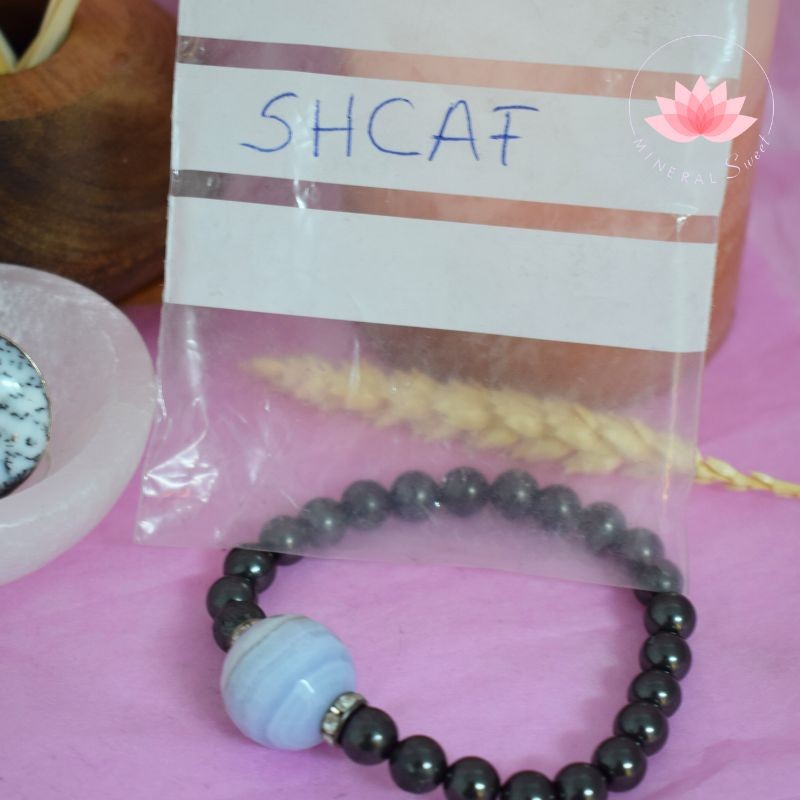 Preciosa pulsera en Shungit, perlas de 8mm con una perla de Calcedonia facetada de 17mm.