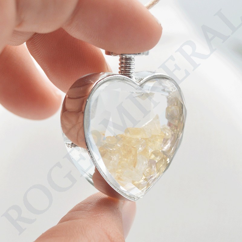 Bonito colgante en cristal, forma corazón, con piedrecitas de Citrino en el interior. Montado en metal.