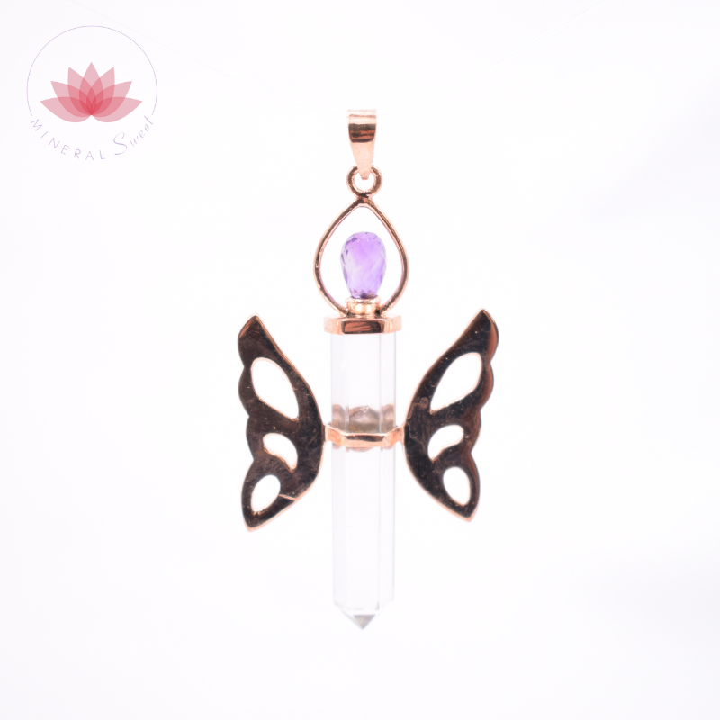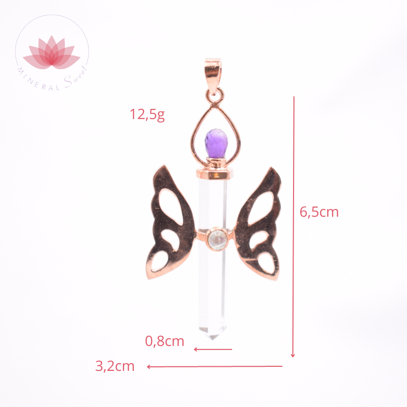 Colgante que recuerda a una mariposa con alas y partes metálicas de cobre, cuerpo de punta de Cristal de roca y gemas de amatista y Labradorita.