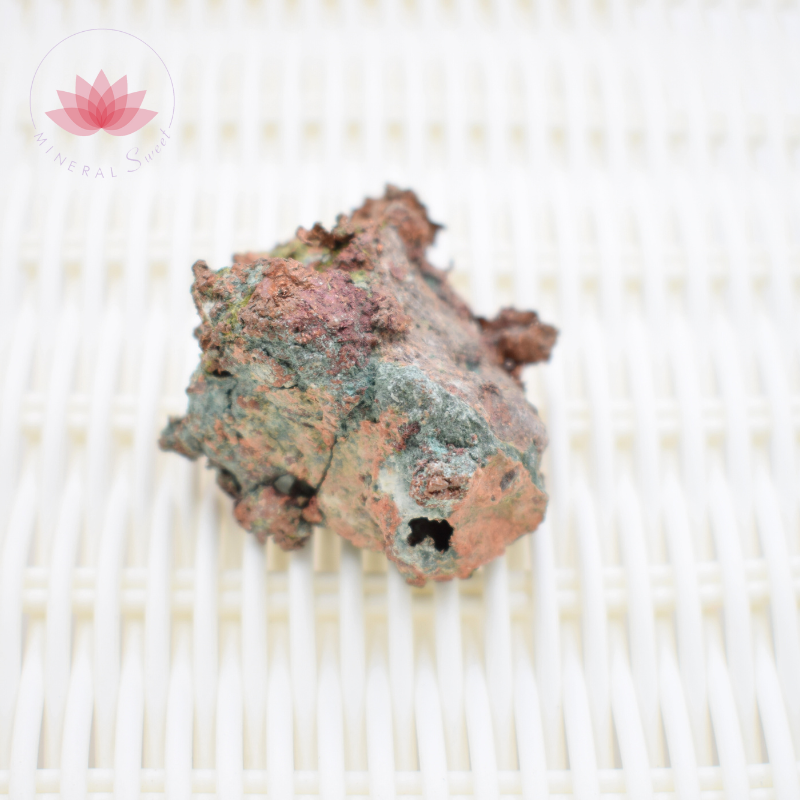 Simbolismo del cobre nativo: el rojo es el color de Marte, el planeta del dios del mismo nombre; mientras que el verde es el color de Venus, planeta de la diosa Venus-Afrodita. En la mitología grecolatina, Marte y Venus son amantes. El cobre naturalmente rojo se vuelve verde por oxidación húmeda, es decir, por el agua, el elemento de Venus. Estos dos colores son complementarios.