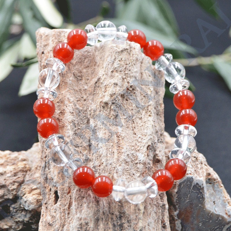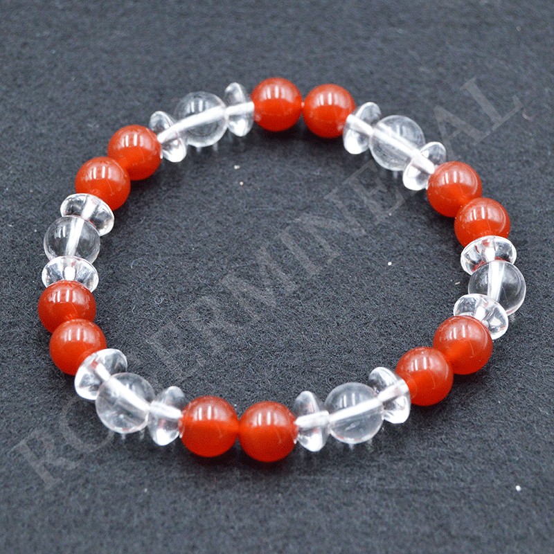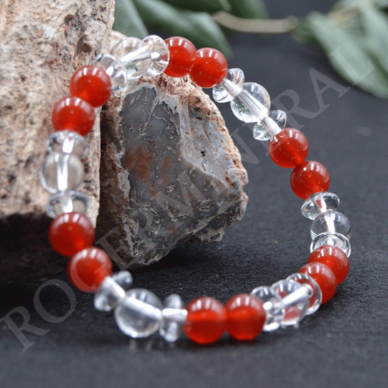 Elegante pulsera que combina perlas redondas de Cornalina con perlas redondas y perlas finas de Cristal de roca.