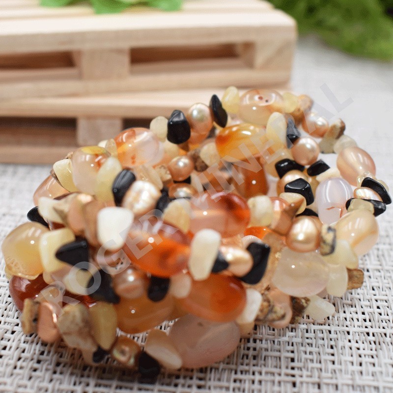 Bonita pulsera con piedras rodadas pequeñas de cornalina y chips en citrina, cuarzo ahumado, jaspe y perlas de cultivo.
