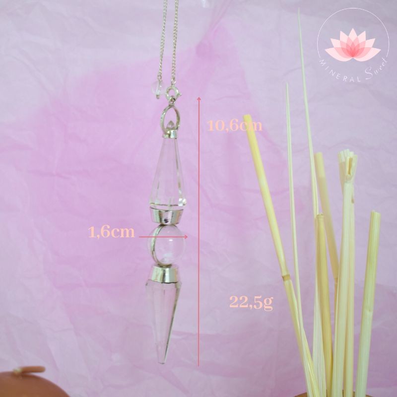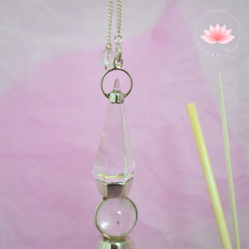 Bello péndulo en Cristal de roca, dos puntas facetadas y una esfera, montaje en plata.
