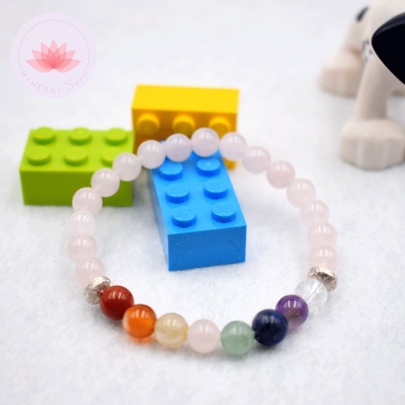 Pulsera para niña en cuarzo rosa, perlas de los 7 chakras y piezas de metal color plata.