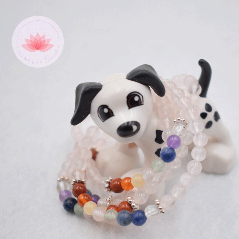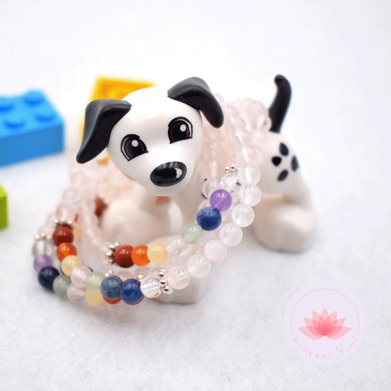 Pulsera para niña en cuarzo rosa, perlas de los 7 chakras y piezas de metal color plata.