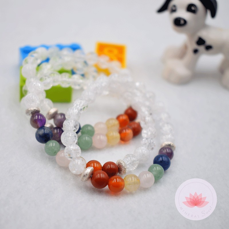 Pulsera para niña en cristal de roca, perlas de los 7 chakras y piezas de metal color plata.