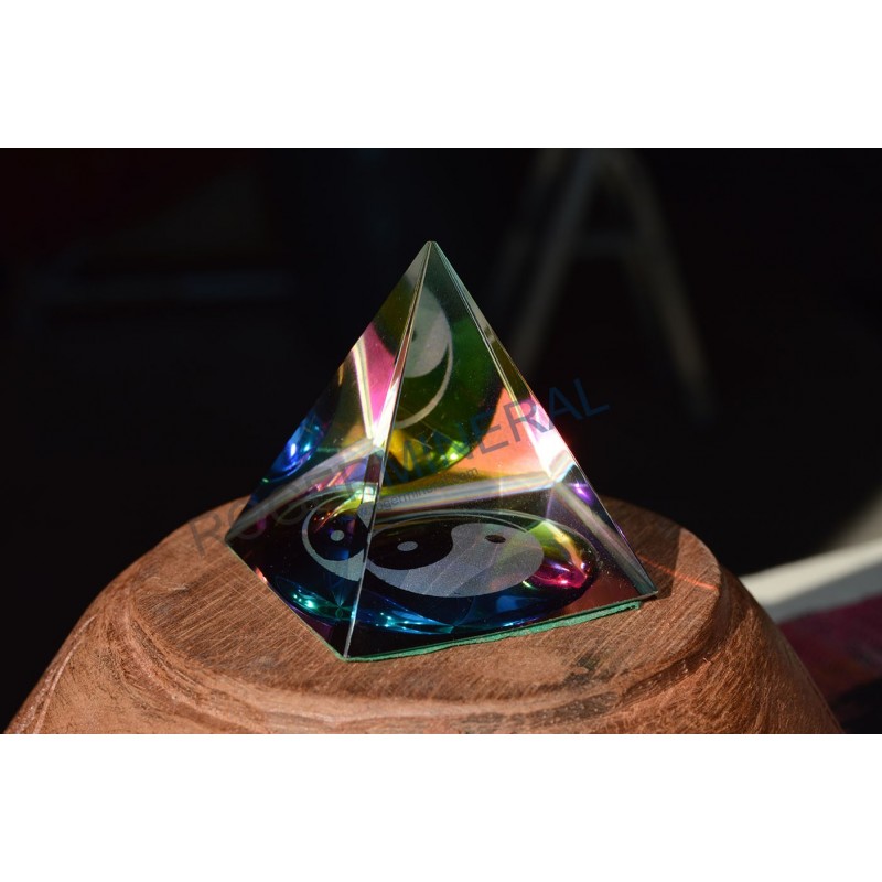 Pirámide en cristal industrial, 4 cm. de lado, con un dibujo Yin-Yang al fondo.