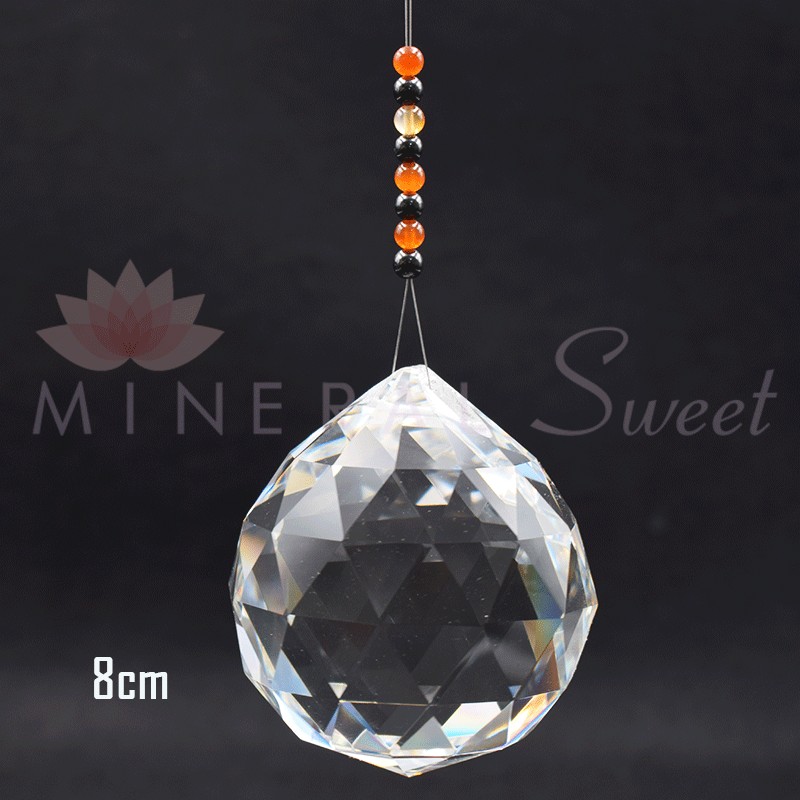Bolas Feng-shui facetadas, de 8cm de diámetro, para suspender, con adición de perlas de Shungit y de Cornalina.