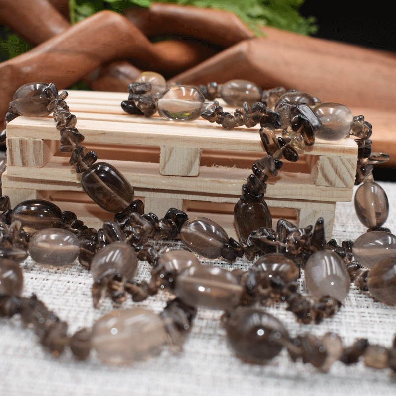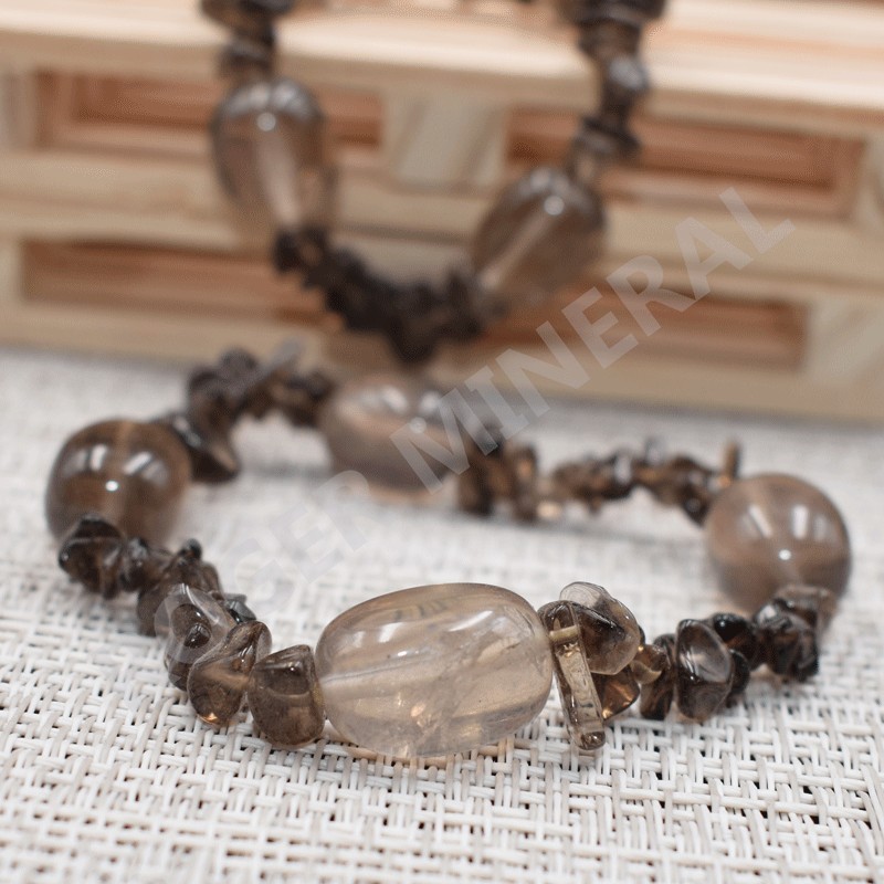 Bonita pulsera que combina chips y piedras rodadas pequeñas de Cuarzo ahumado.