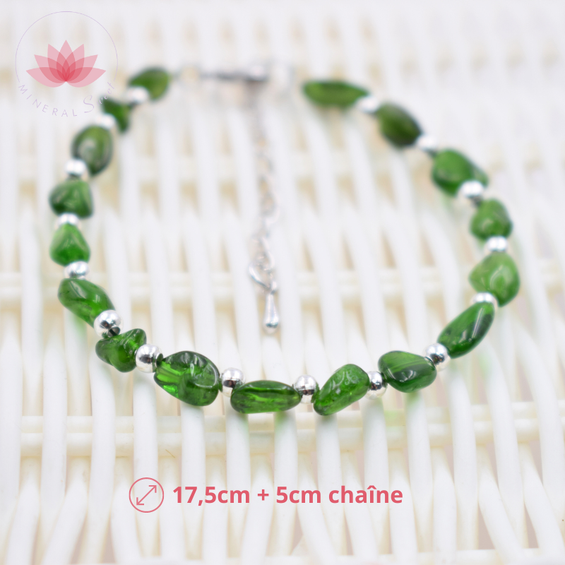 El diópsido verde es una piedra de reconciliación. Actua sobre el chakra 4, el corazón, que ayuda a la persona a perdonarse a sí misma. Permite no continuar con el sentimiento de culpa y a reconciliarse con un mismo. Nos abre a la compasión, a la benevolencia. Abre nuestro corazón al mundo, es una piedra de generosidad.