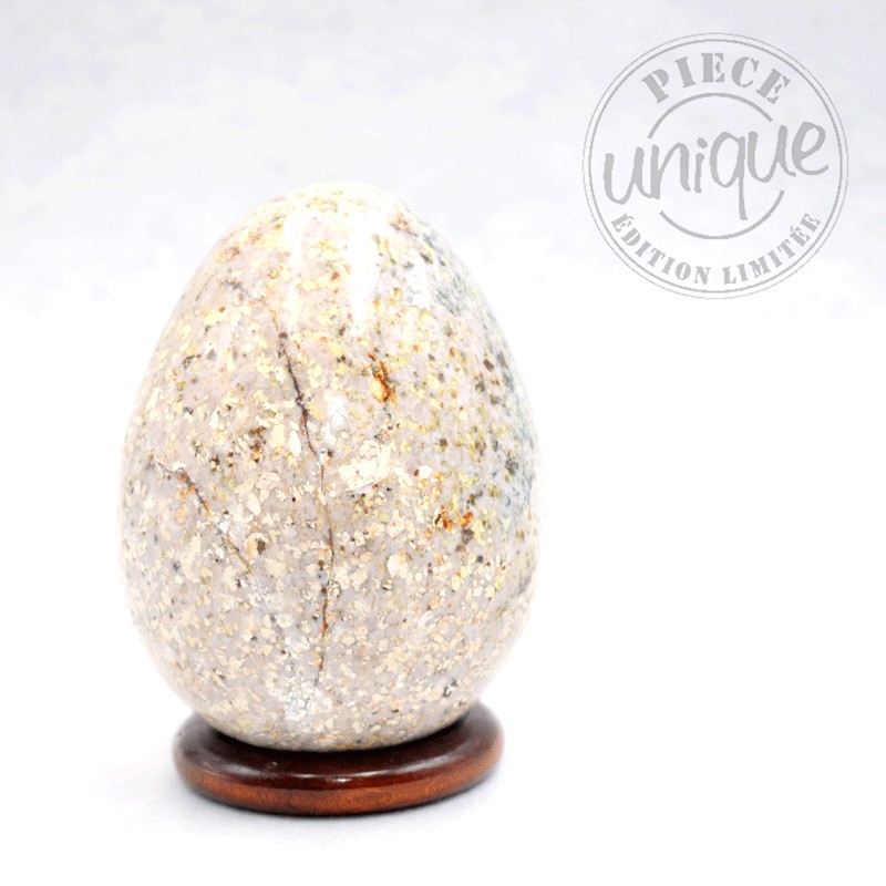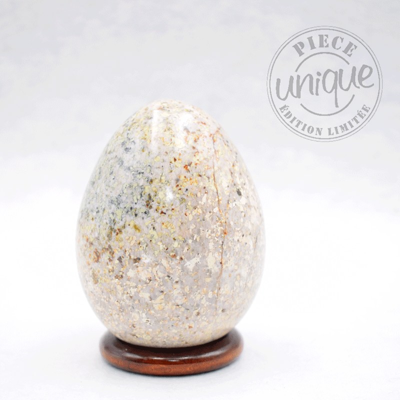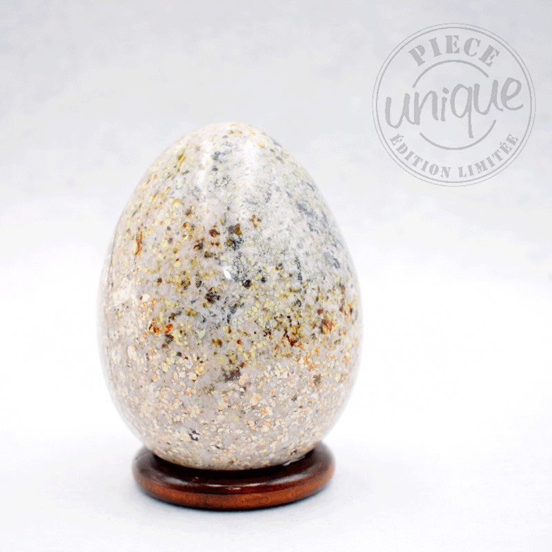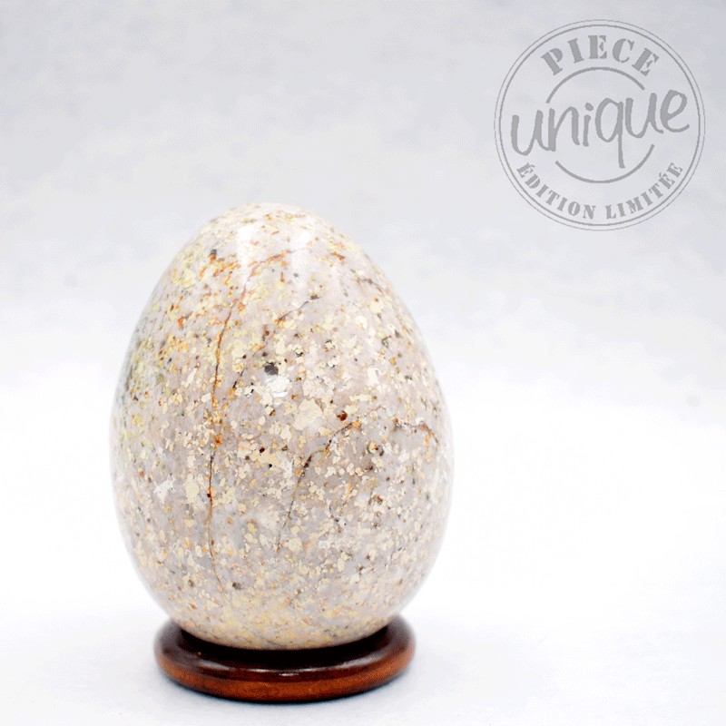 Bello huevo tallado a mano en Espinela de Madagascar. Se envía con un aro de bambú a modo de soporte.