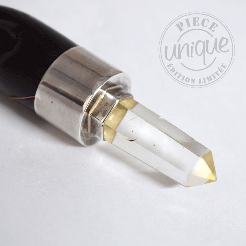 Esta varita consta de un cuerpo en madera y cobre, una punta de cristal de roca, un cubo de 54 pirámides y una pequeña esfera, ambos en cristal de roca.
