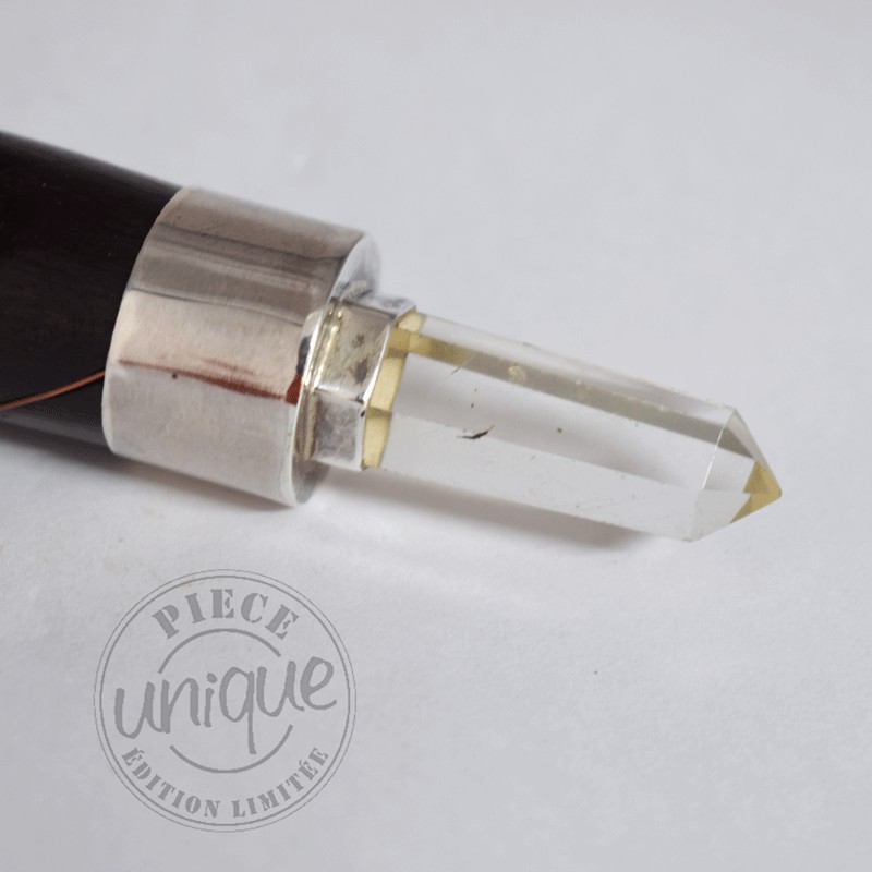 Varita en madera de palo de rosa y cristal de roca, con un eje en cobre. Tallada y ensamblada en India por expertos en práctica energética.