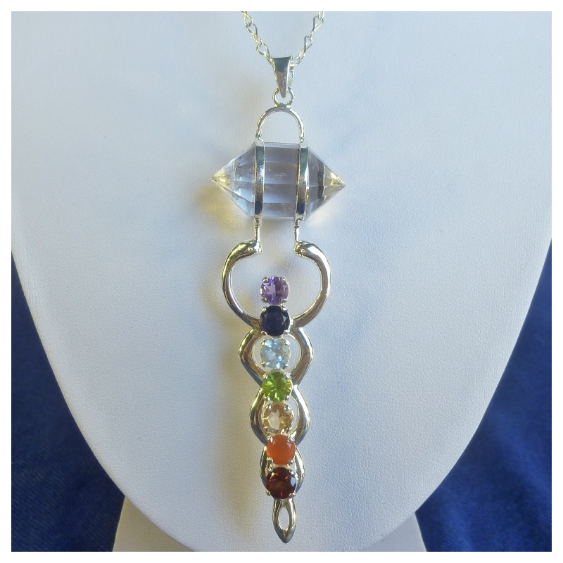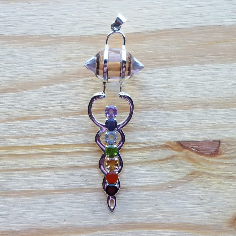 Colgante chapado en plata, compuesto de 7 gemas: Amatista, Iolita, Aguamarina, Peridoto, Citrino, Cornalina, Granate, con un Cristal Vogel en su parte superior.