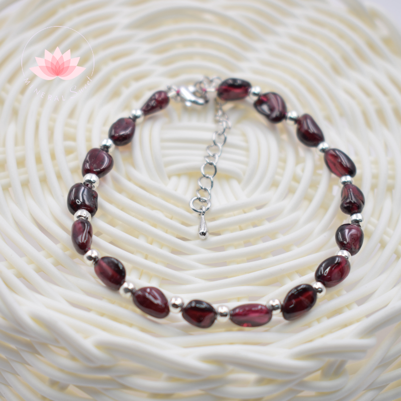 Delicada pulsera de Plata y Granate, con cierre y cadena de plata. Origen: India.
