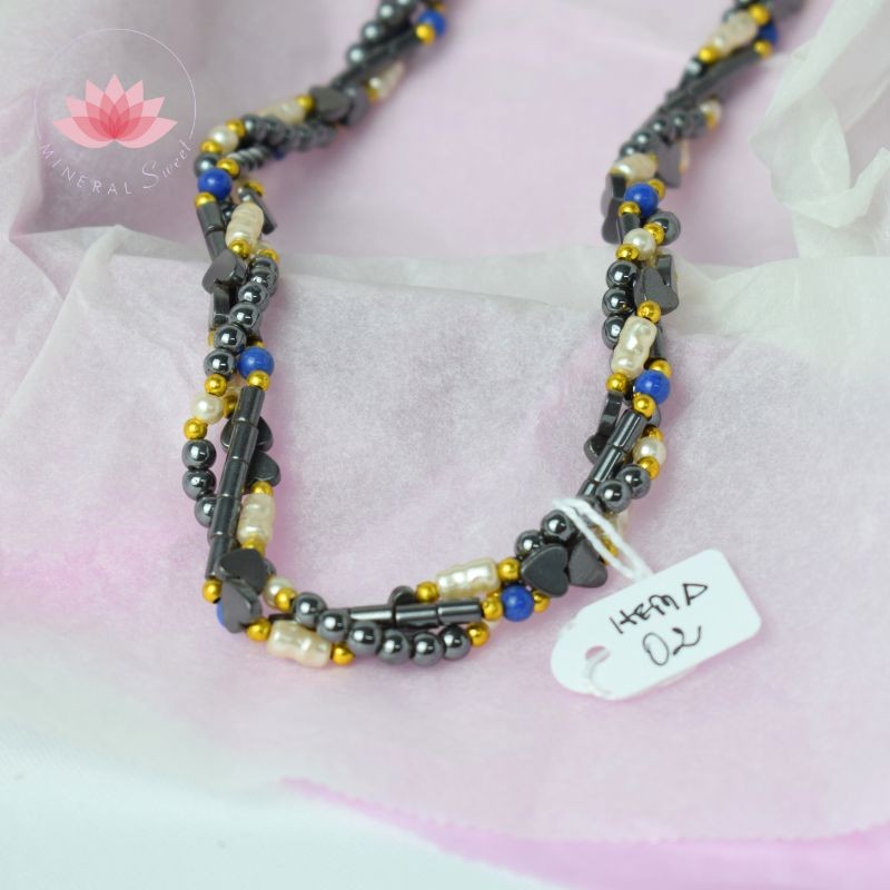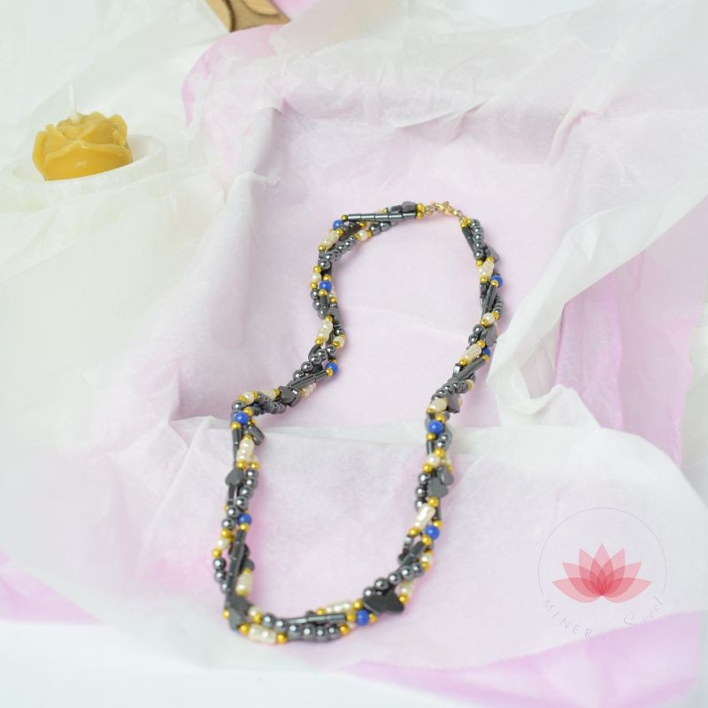 Bello collar en Hematita con perlas de cultivo y lapislázuli, así como bolitas de metal dorado.