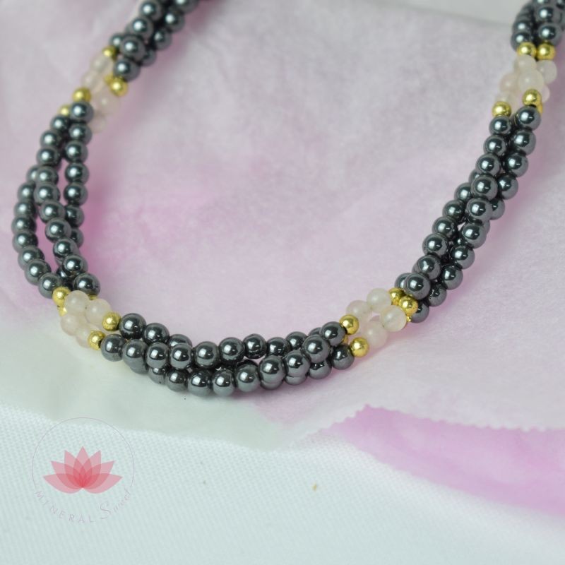 Bello collar en Hematita con perlas de cuarzo rosa.