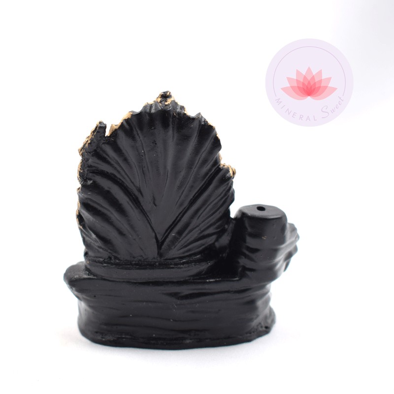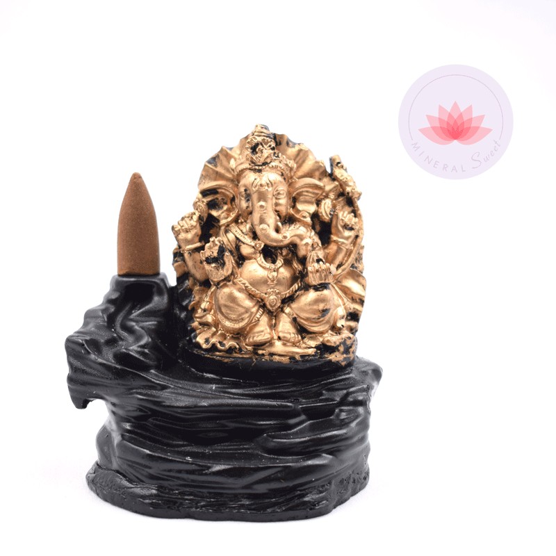 Portaincienso de resina en forma de fuente con Ganesh dorado en trono para quemar incienso en cono.