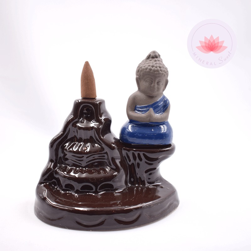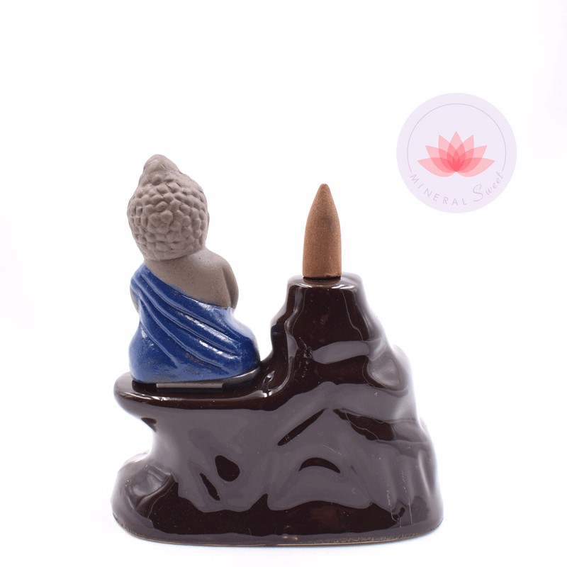 Portaincienso de cerámica en forma de fuente con Buda en azul para quemar incienso en cono.