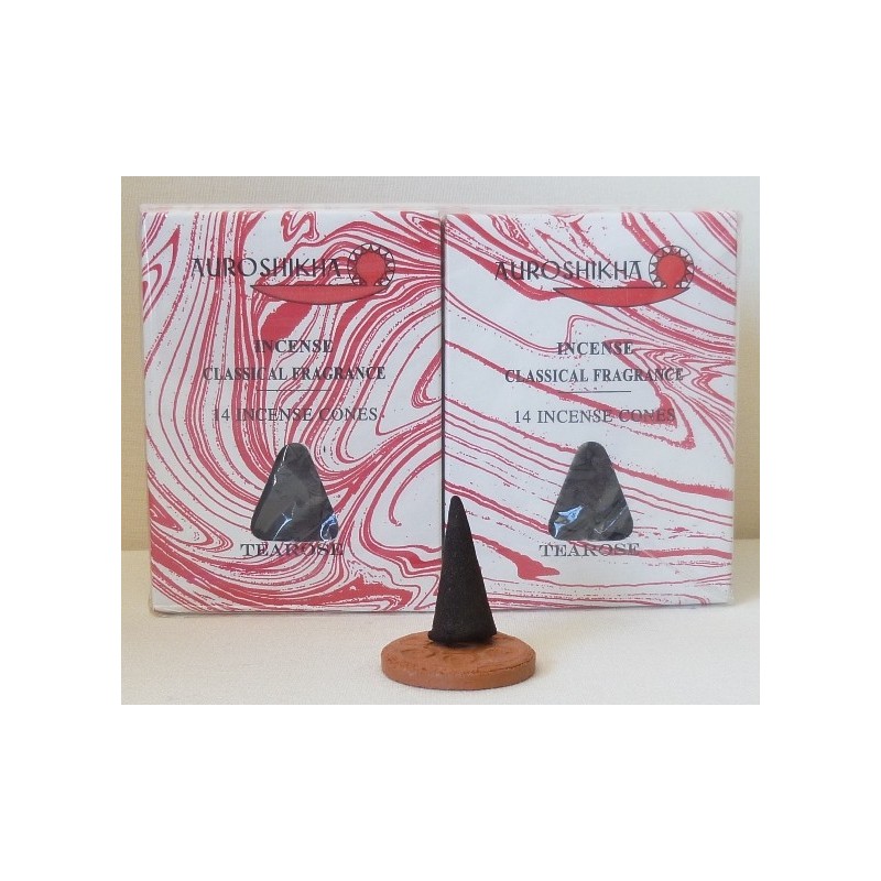 Cajita que contiene 14 conos de incienso al aroma de Rosa de Té + 1 base circular en arcilla.
