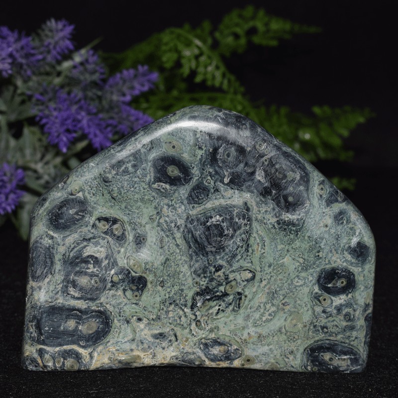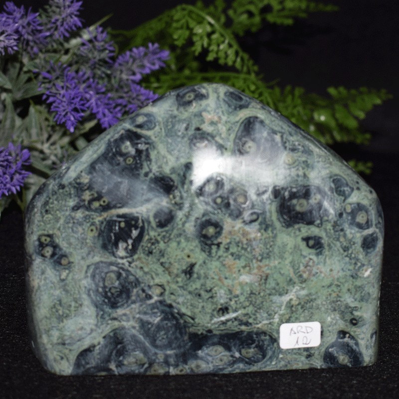El nombre de este jaspe, verde o Kimbaba orbicular, viene de los dibujos en forma de círculos que presenta. Son formas verdes circulares, con círculos interiores negros en el caso del Kimbaba.