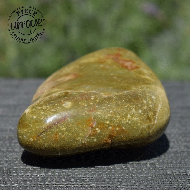 Piedra de equilibrio por excelencia, el jaspe favorece las cualidades de la persona. Por su color, el jaspe Kimbaba u orbicular está relacionado con el txakra 4, el corazón. Sus dibujos proporcionan impulsión al movimiento, mayor abertura de espíritu, el deseo de nuevas experiencias... Es una piedra que abre a la alegría y al buen humor.