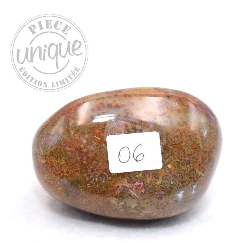 Este jaspe en particular, por sus dibujos, ofrece el simbolismo del movimiento. Por sus colores, está relacionado con los chakras 3 y 4 principalmente (plexo solar y corazón).