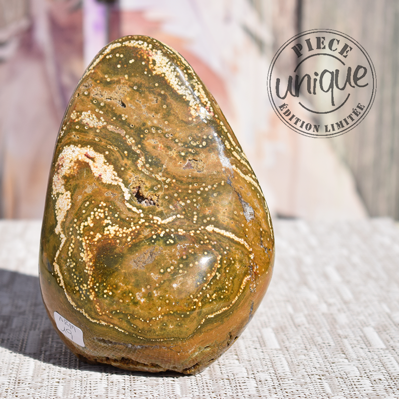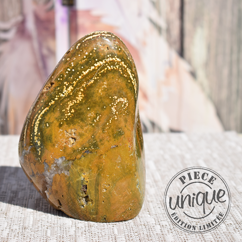 Este jaspe en particular, por sus dibujos, ofrece el simbolismo del movimiento. Por sus colores, está relacionado con los chakras 3 y 4 principalmente (plexo solar y corazón).