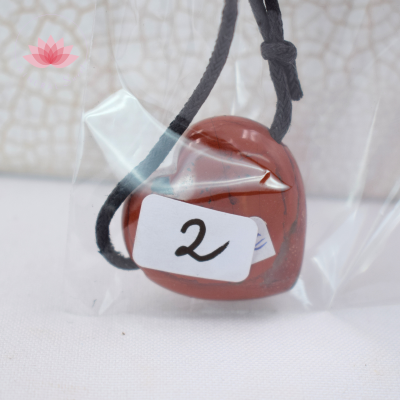 Colgante en fora corazón en Jaspe rojo de Madagascar, con un cordón de color negro.