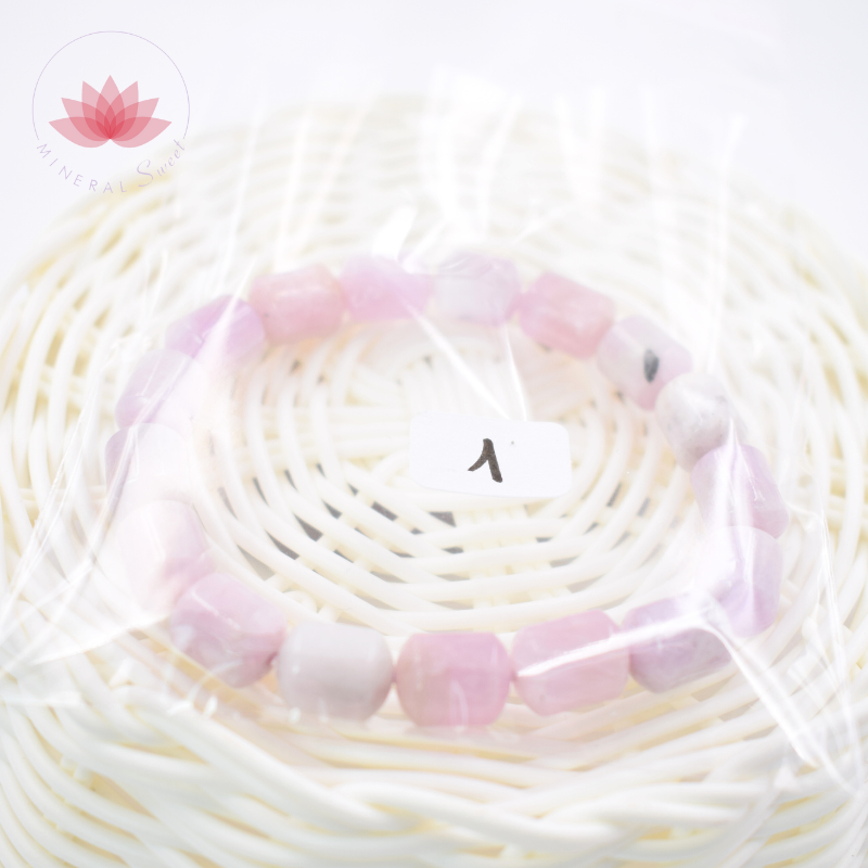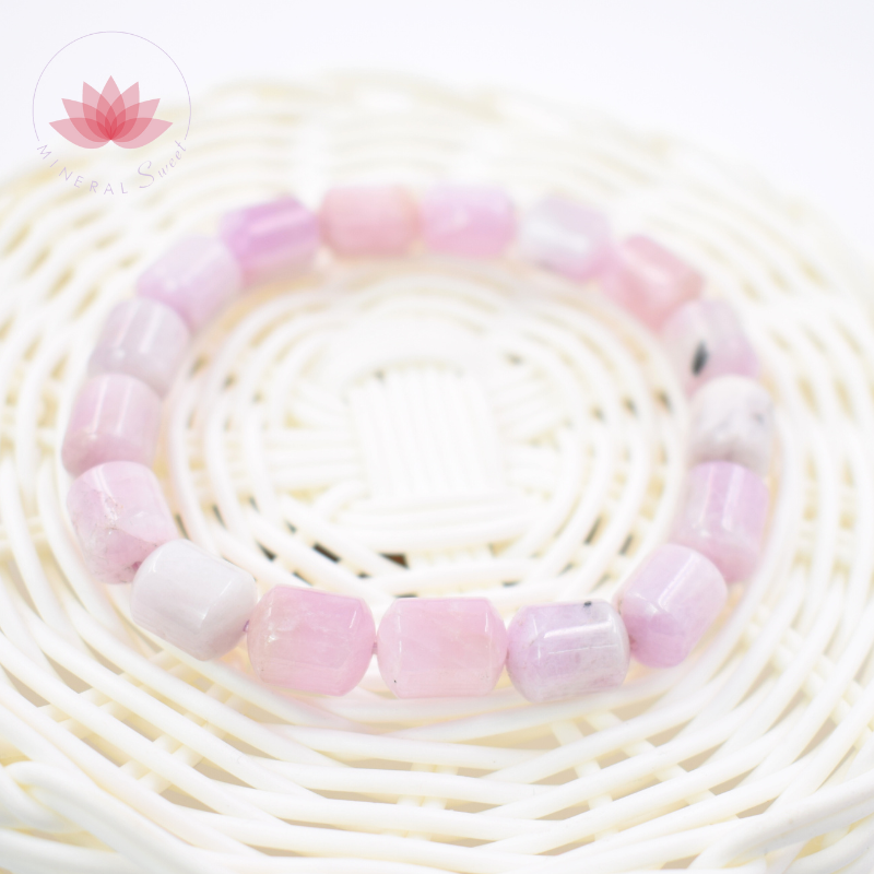 PUlsera de Kunzita bruta en perlas cilíndricas de 1cm de largo y 8mm diámetro.
