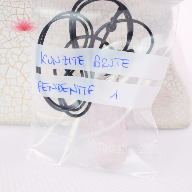Colgante de Kunzita bruta con una anilla y enganche en metal plateado. Se vende con un cordón negro.