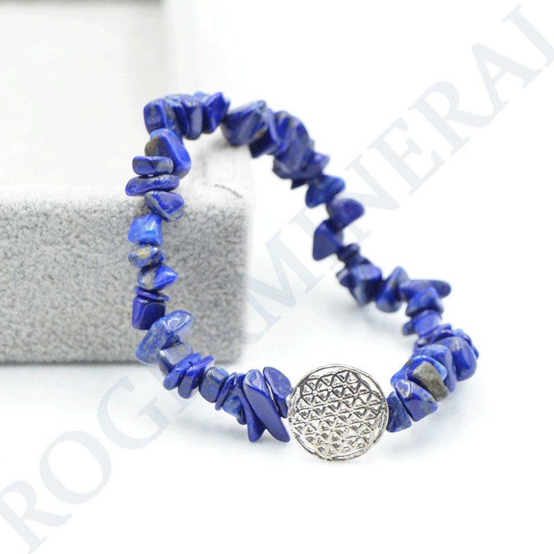 Bonita pulsera en perlas barrocas de Lapislázuli con una flor de vida en metal plateado.