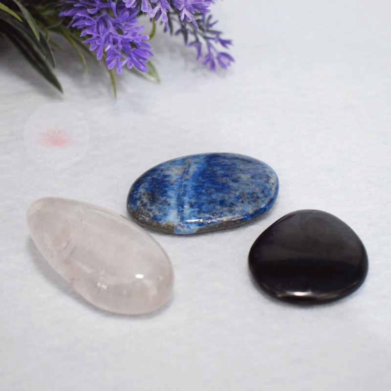 Pack compuesto por tres piedras pulidas: Lapislázuli, Cristal de Roca y Shungit.