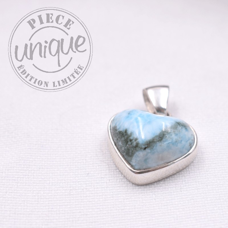 Bello colgante de Larimar montado en plata de 925 en forma de corazón.