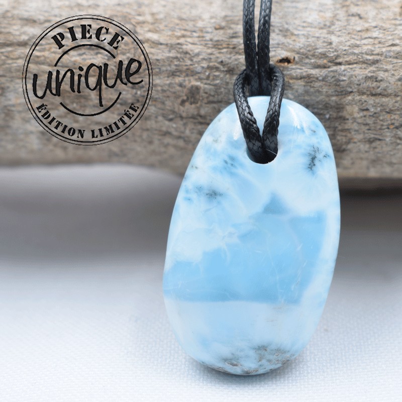 Bello colgante de Larimar en una piedra pulida con un cordón.