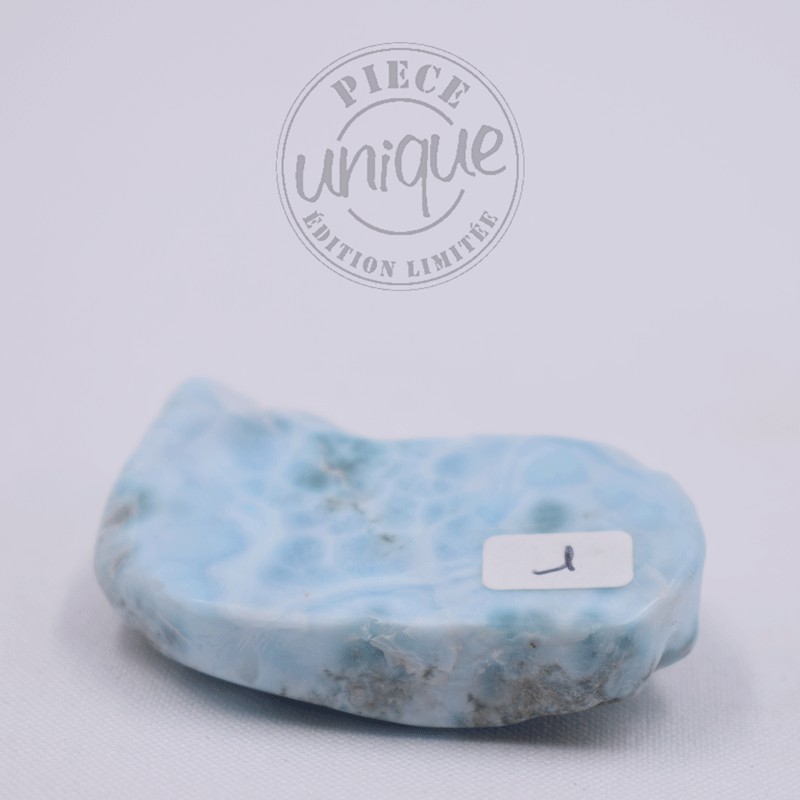 Es una piedra de una gran dulzura, de ternura. Su color apacigua, relaja. Es armonía, ligereza de ser. Tiene la cualidad de cazar los miedos, los temores, los sentimientos de culpa. Por su tono azul celeste, es anti estrés.