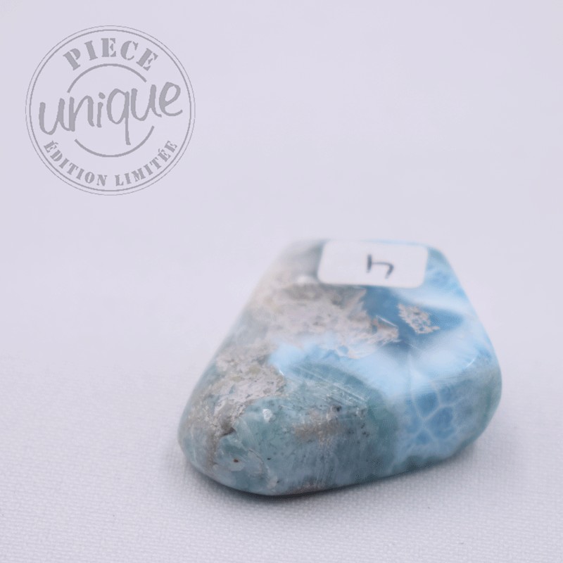 Es una piedra de una gran dulzura, de ternura. Su color apacigua, relaja. Es armonía, ligereza de ser. Tiene la cualidad de cazar los miedos, los temores, los sentimientos de culpa. Por su tono azul celeste, es anti estrés.